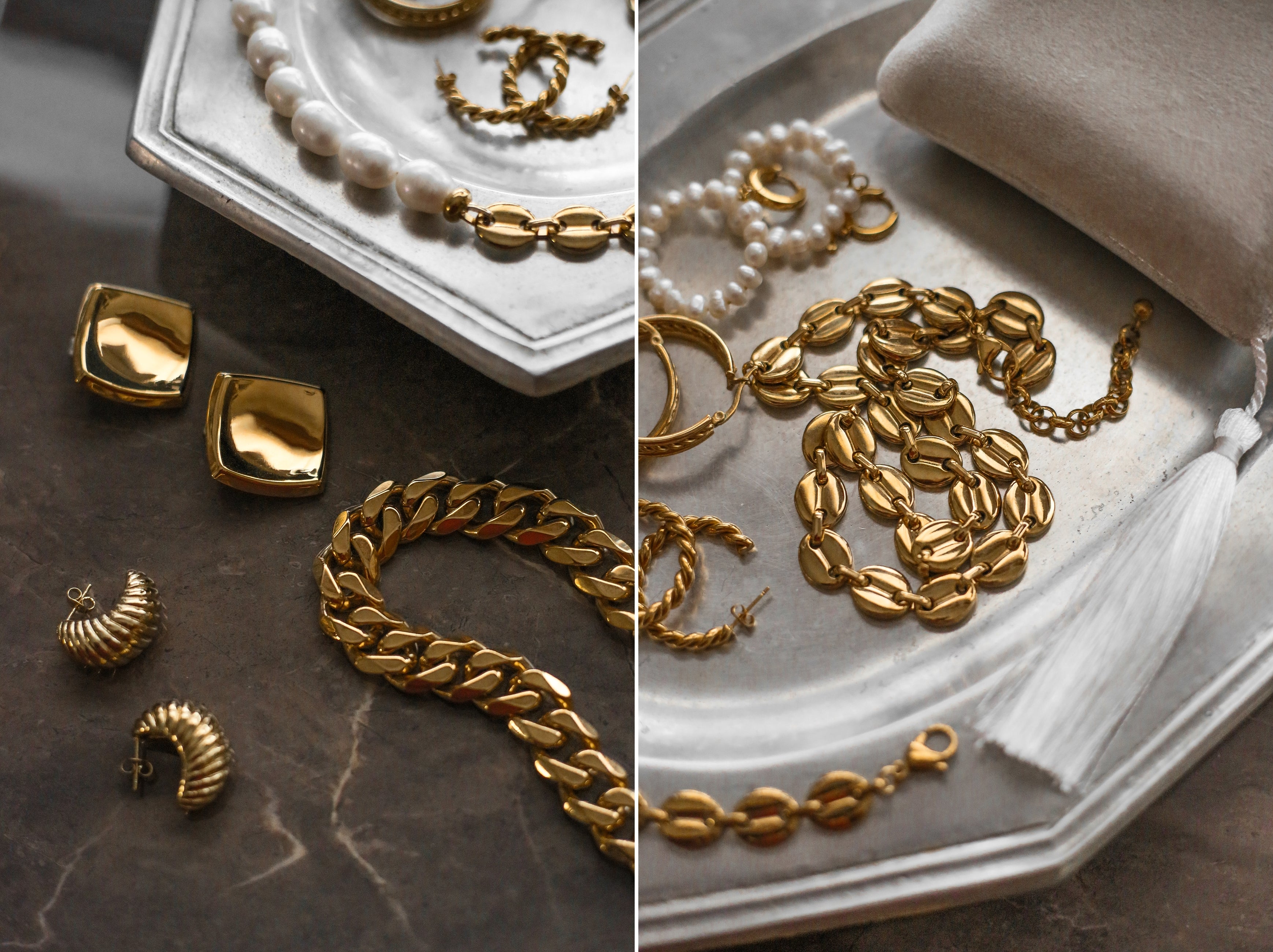 Our choice of stainless steel as a base material reflects our commitment to quality and longevity, ensuring that each piece withstands the test of time. We primarily use high-quality 18k gold-plated stainless steel for its durability and resistance to tarnishing, ensuring your pieces retain their golden glow.