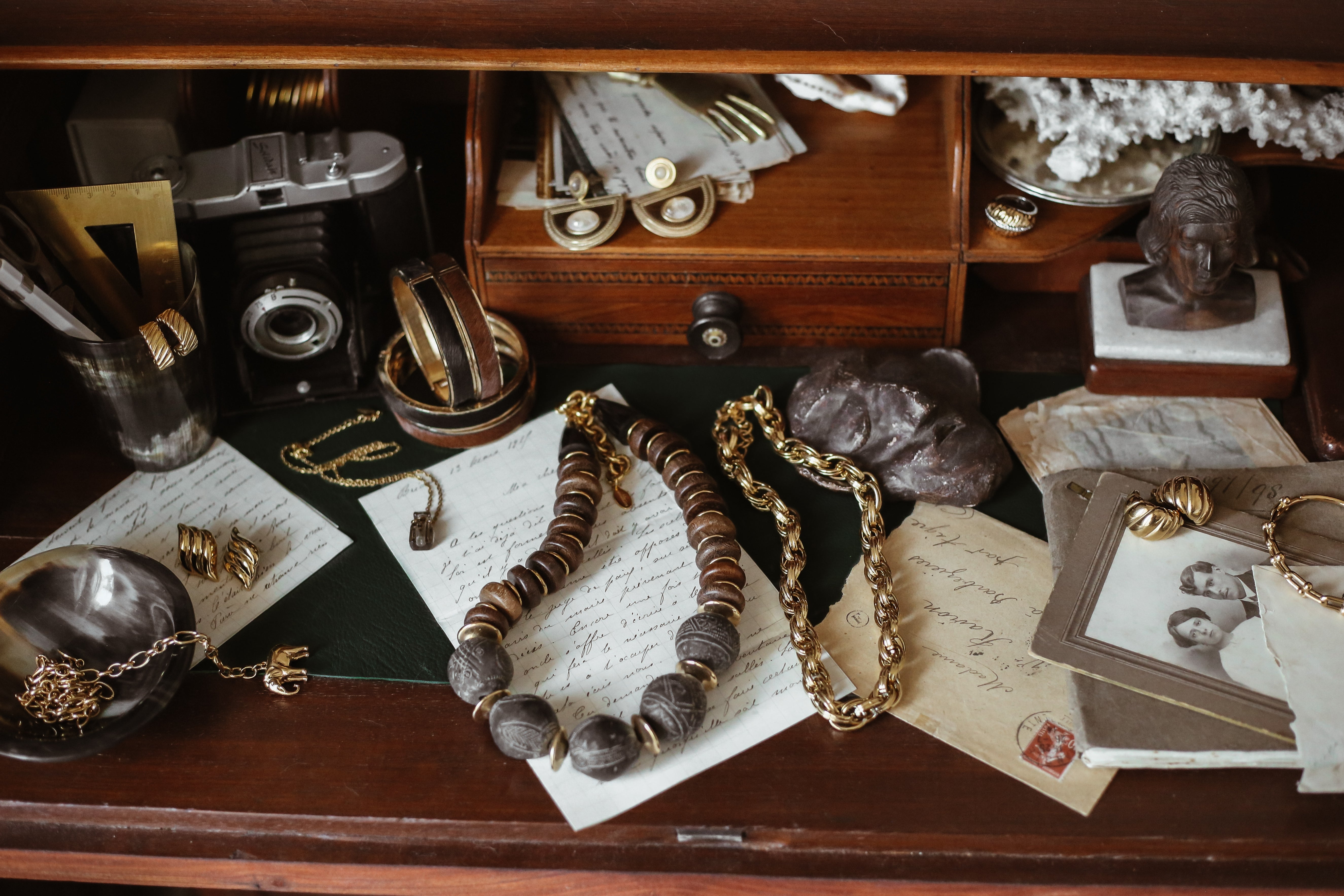 There are moments that feel suspended between memory and dream. A desk scattered with letters, postcards from another century, the patina of travel-worn objects, and the soft weight of jewelry set ...