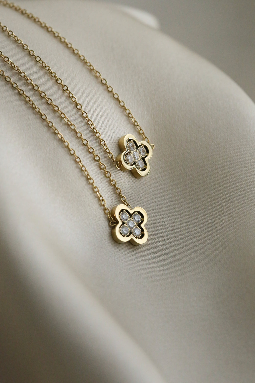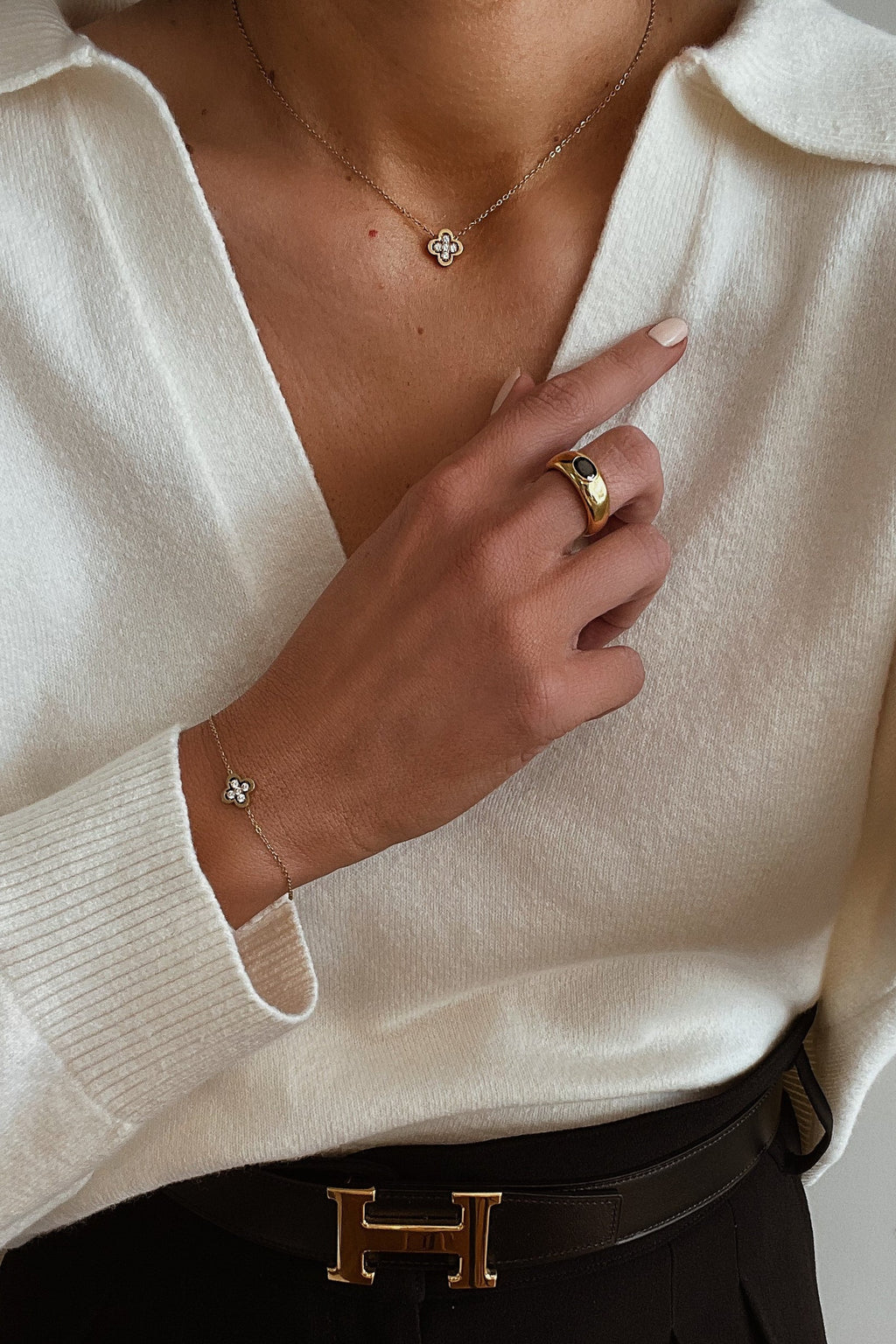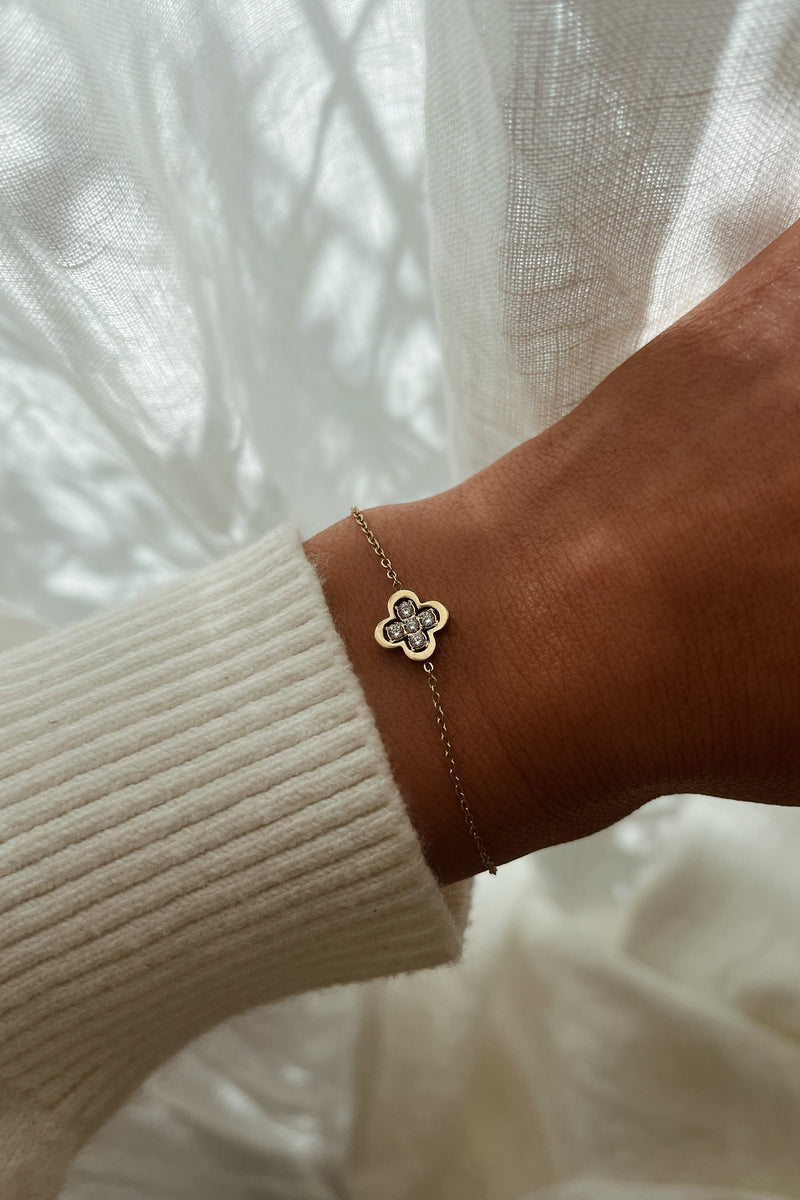 Stackable dainty bracelet with tiny rhinestones on a quatrefoil central piece.